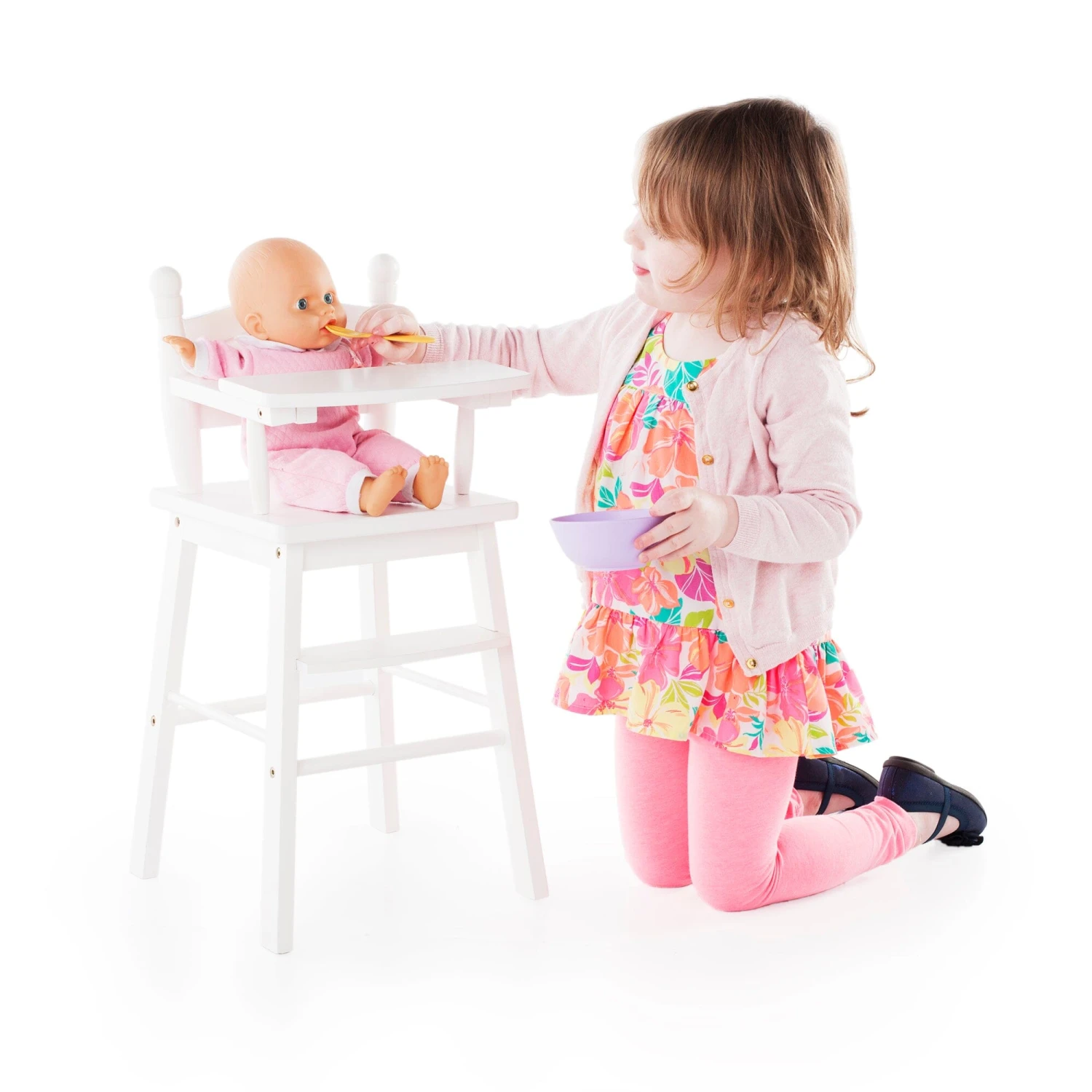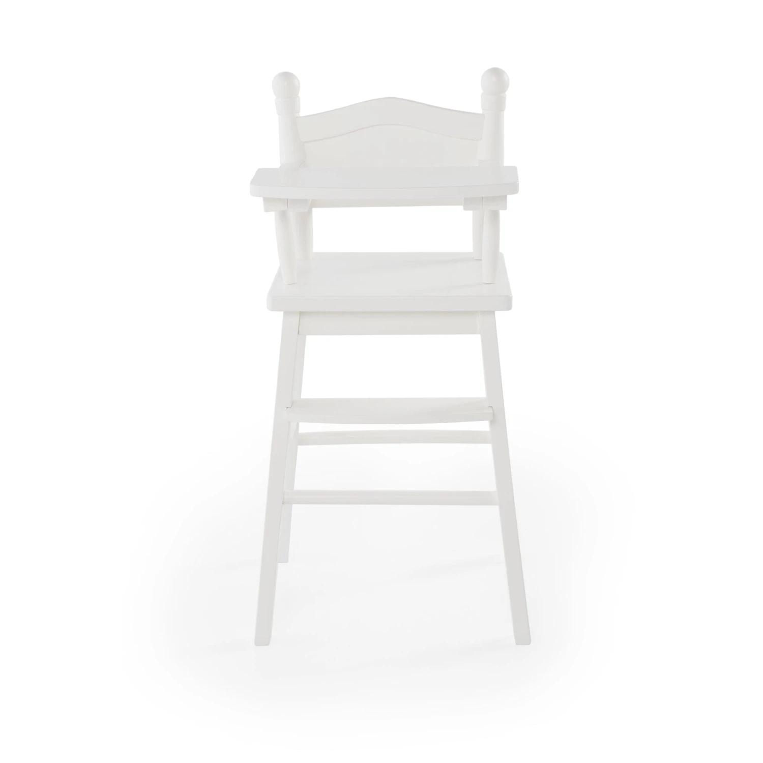 This wooden doll high chair features a clean modern design, ample space for baby doll to sit, a foot rest. Hardwood solids with a durable clear coat finish. Sturdy construction ensures years of rigorous use.