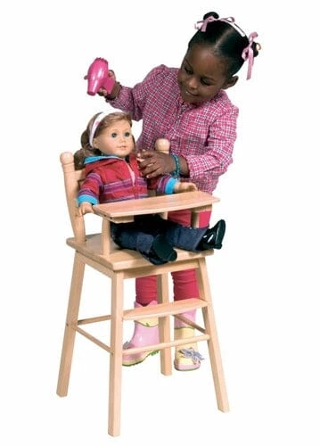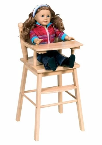 This wooden doll high chair features a clean modern design, ample space for baby doll to sit, a foot rest, and clear coat acrylic finished look. Great for reading, feeding and imaginative doll play.