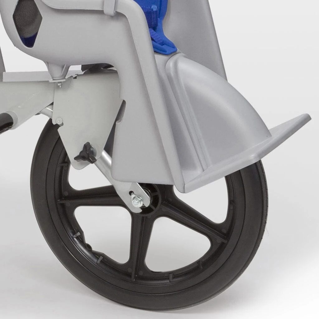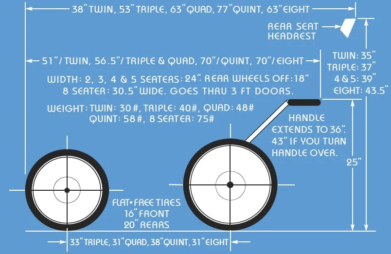 Maximum seat weight is 18kg (40lbs). Front tires measure 40 cm (16”)D and rear tires measure 50 cm (20”).