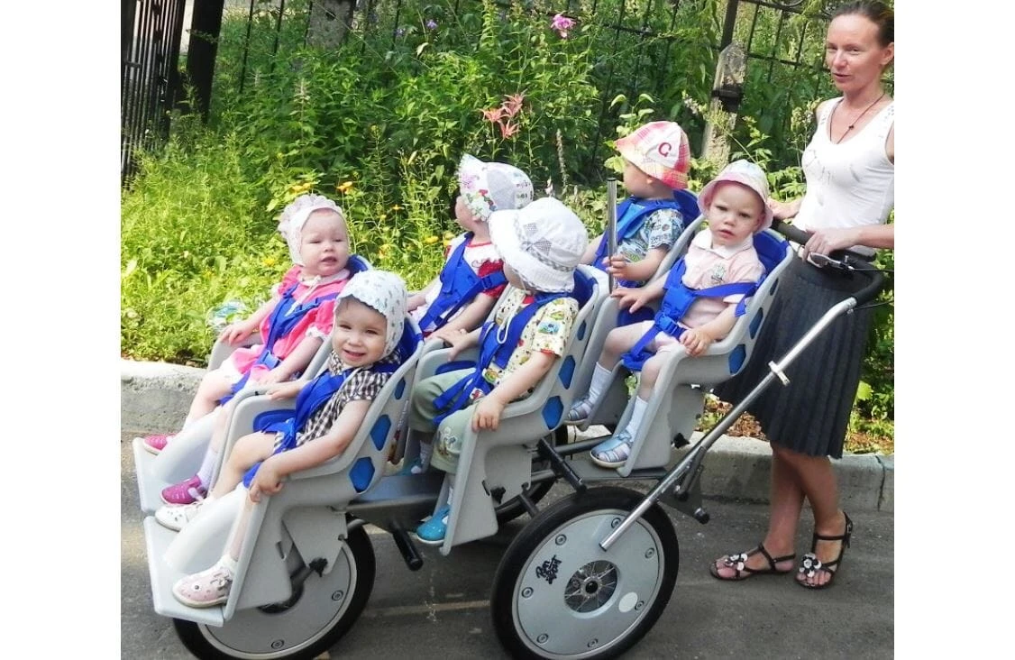 Accommodates 3-8 children using the same base. The pull-out seats can be arranged and added to in many ways. The handle is easily adjustable, as is the angle of the seats.