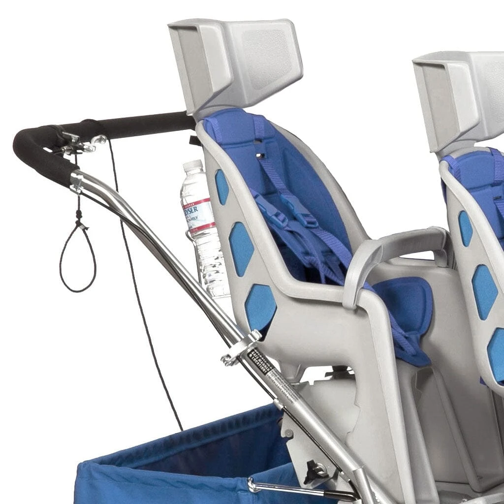 Front caliper brakes now have a ‘lock-button’ on the brake lever. Safety features include a parking brake, dual rear drum brakes and wheel discs to protect fingers from spokes. Seat belts and safety harnesses on each seat.