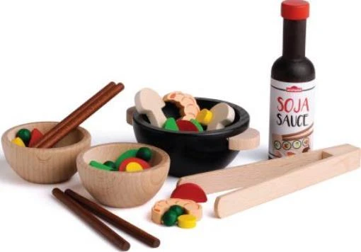 Practice handling chopsticks with this durable assortment of wood play food and utensils.