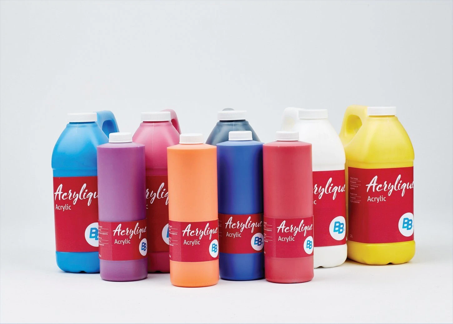 B&B Acrylic paints come in 14 different colours and three sizes: 118 ml, 500ml, 2L bottles.