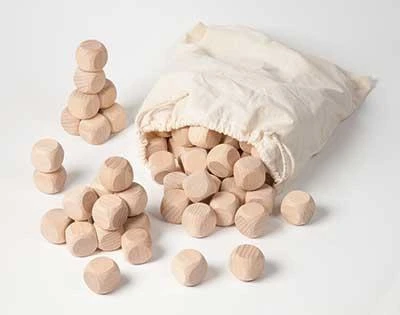The bag of building dice invites children to build, sort and design freely. Made from natural beechwood with rounded edges in a linen bag.