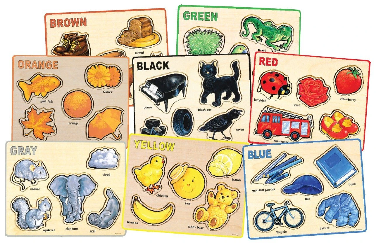 Learn basic colours with this set of 8 wooden inlay puzzles with raised, easy to grip, lift-out pieces. Each object has the corresponding word printed on the puzzle tray helping children to recognize these colours and words.