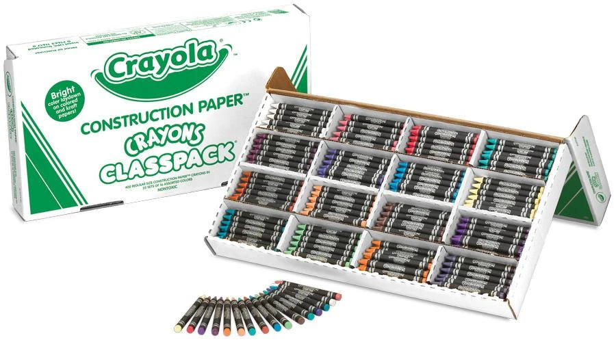 Class pack featuring 400 wax crayons. 16 assorted colours (25 crayons of each colour).