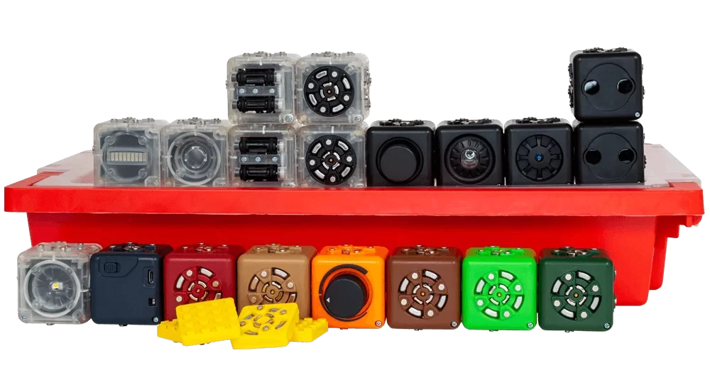 Includes 19 Cubelets: 1 each of battery, bar graph, blocker, brightness, flashlight, inverse, knob, maximum, minimum, passive, speaker, temperature, and threshold; 2 each of distance, drive, and rotate, 4 LEGO® brick adapters, 1 charging cable and 1 storage tub.