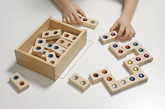 Includes 28 wooden tiles, each with 2 inset plastic diamonds in 7 different colours. Supplied in a wooden box with transparent lid.