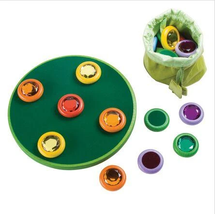 Put the Gem Twirler into motion, to create dazzling gyro patterns. Safe acrylic gem stones are enchanting addition for your loose parts and block play. Flocked, wooden turntable approx. 25 cm(10”)in Diameter. 12 Gemstones with flocked bottom, approx. 4.5 cm (1.8”) in diameter, in 6 colours, in velvet bag. Age 18 months+.