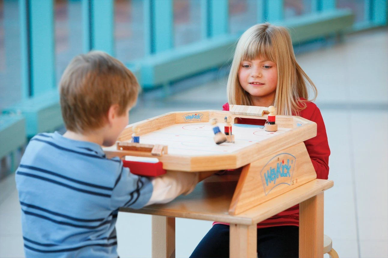A lively hockey game, players use magnets underneath the board to guide players score in goals. a central bar to prevent players from crossing into the opposing zone. Solid wood construction of the large raised hexagonal game board (87.5cm x 17cm high) ensures long classroom life. For 2 to 4 players.