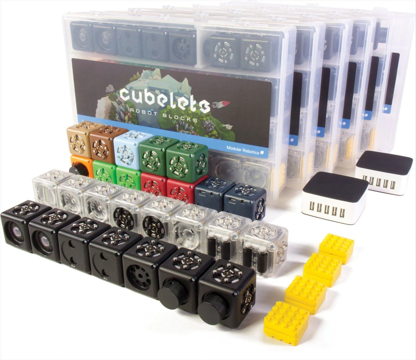 Ultra-comprehensive pack includes: 156 Cubelets: 12 Battery, 12 Passive, 12 Inverse, 12 Blocker, 6 Bluetooth, 6 Minimum, 6 Maximum, 6 Threshold, 12 Distance, 12 Brightness, 12 Knob, 6 Temperature, 12 Drive, 12 Flashlight, 12 Rotate, 6 Speaker, 6 Bar Graph, 6 Bluetooth hats, 48 adapter for LEGO®, (2) 5-port chargers and cables, in 6 tubs.