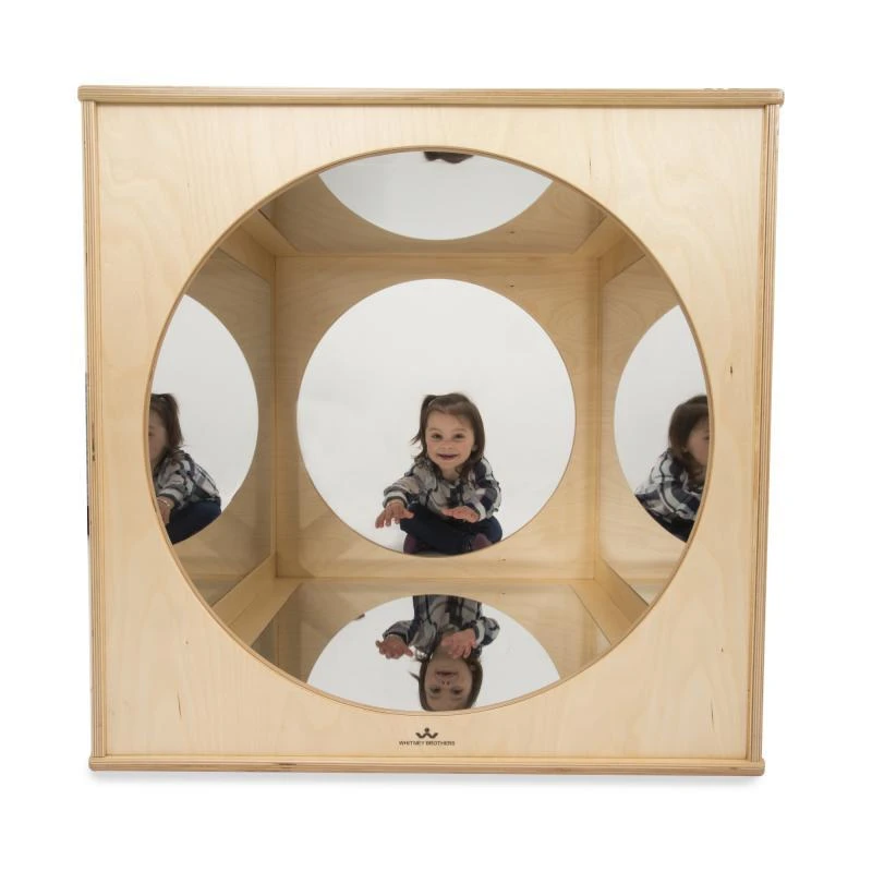 Four safe, shatterproof acrylic mirrors are attached inside the bottom, top and two opposite sides of this six-sided cube cabinet to create a kaleidoscope of images and perspectives that invite children to crawl inside and explore.