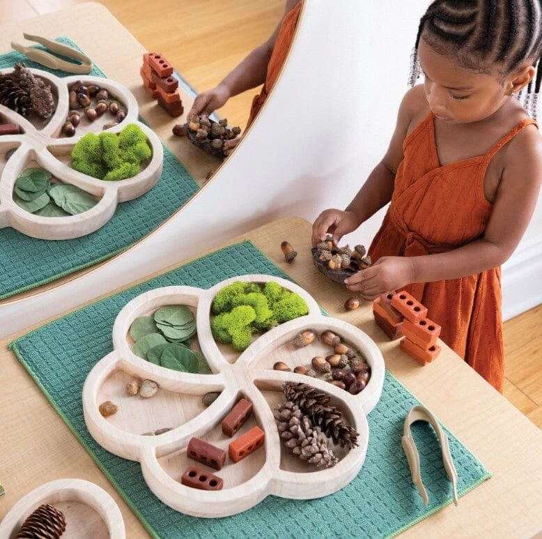 The curved trays have many compartments ideal for sorting, early math counting, and patterning activities. Durable trays encourage loose parts exploration & can be used indoors or out.