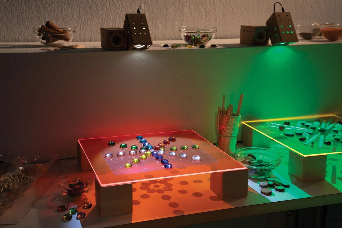 Unique colour, pattern exploration with coloured acrylic plates. Introduce mandala art, explore natural materials on a light panel. Foils made from recycled PE invite fine motor creativity and STEM investigation of shapes and symmetry.