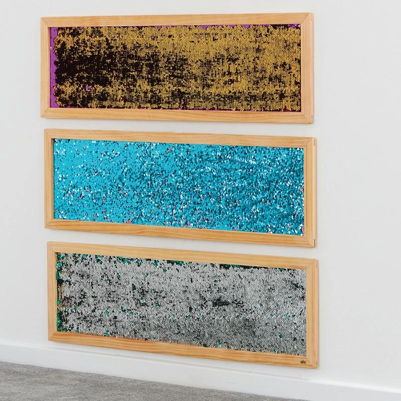 Add dazzle to your walls with these long wood and sequin boards. Stroking sequins in different directions changes colours for impermanent creative expression.