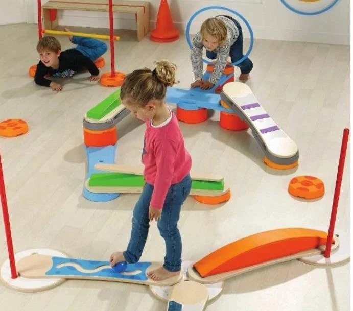 Modular courses develop a sense of balance, observation, coordination and muscle strengthening. Compatible wooden and plastic units.