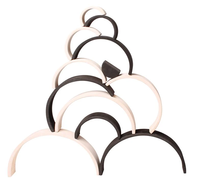 Stack, sort, build and inspire imaginative play with these unique proportional wood arches for ages 1 year and older. Keep a ball on-track through tunnels and bridges. Build a farm, magical homes, inspired sculptures or even a doll cradle: the variety of sizes means endless possibilities. Carefully manufactured from natural wood, with a non-toxic plant based oil finish.