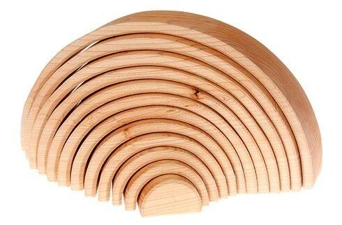 Stack, sort, build and inspire imaginative play with these unique proportional wood arches for ages 1 year and older. Keep a ball on-track through tunnels and bridges. Build a farm, magical homes, inspired sculptures or even a doll cradle: the variety of sizes means endless possibilities. Carefully manufactured from natural wood, with a non-toxic plant based oil finish. 12 pieces. Size: length 38 cm, height 18 cm. Diameter = 4.5 cm. Age 1+.