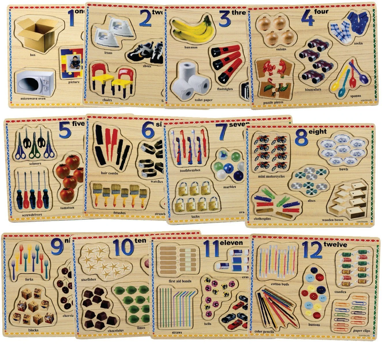 Learn numbers from 1-12 with this large set of 12 individual puzzles. Each puzzle includes pictures with the corresponding number of items. Puzzle pieces are raised for easy pick up. Each puzzle measures 17cm x 22cm (6¾” x 8½”). Ages 3+.