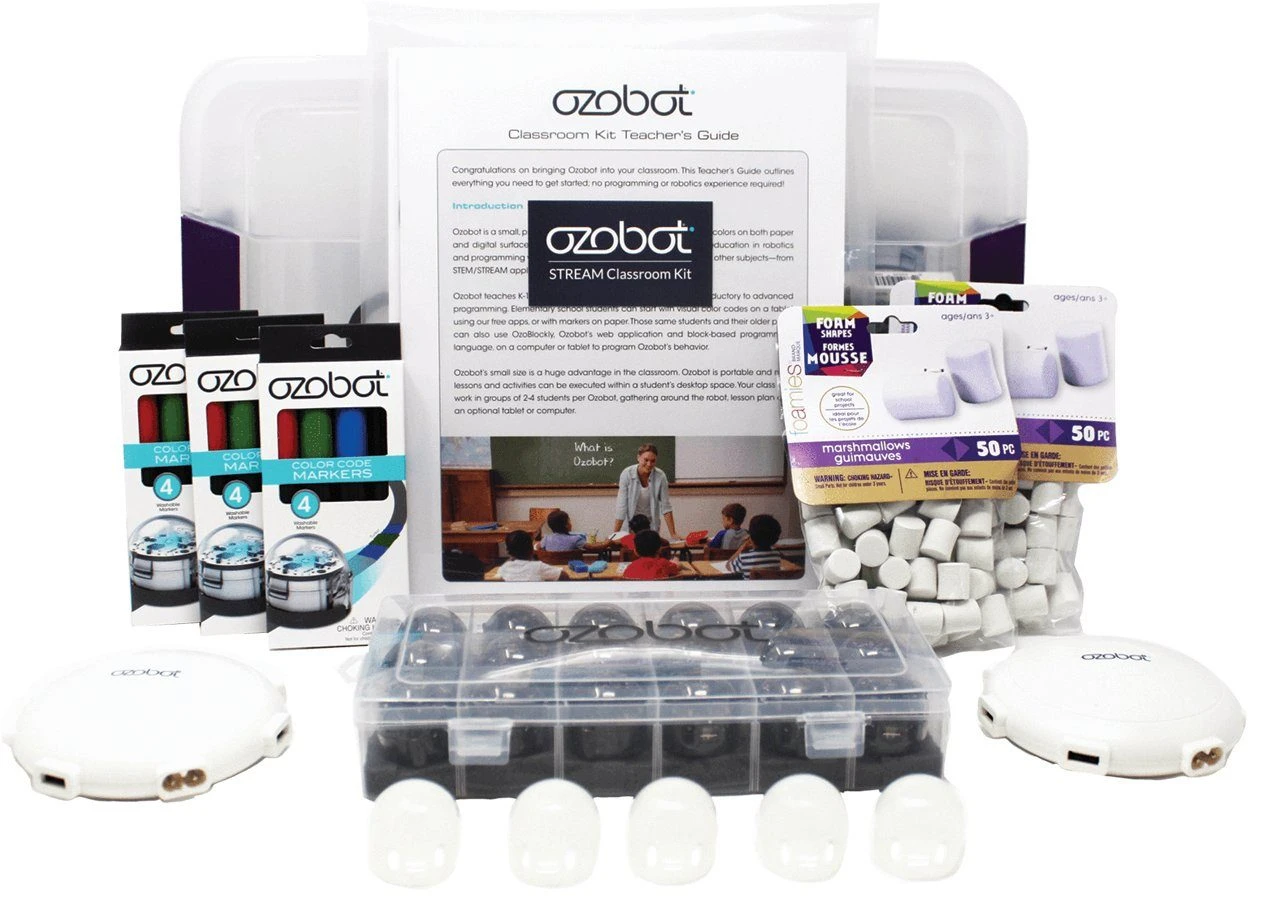 Includes 12 Ozobot Evos, 12 clear DIY skins, 2 multi-port chargers, 12 sets of colour code markers, 12 Ozocode sheets, Educator’s Guide, drawing tips sheet, OzoBlockly Getting Started guide, calibration tips sheet, 6 calibration dot template sheets, Ozobot Driver’s Ed Activity with foam cylinders, log sheet, 20 certificates, Ozobots storage box and classroom kit storage bin.
