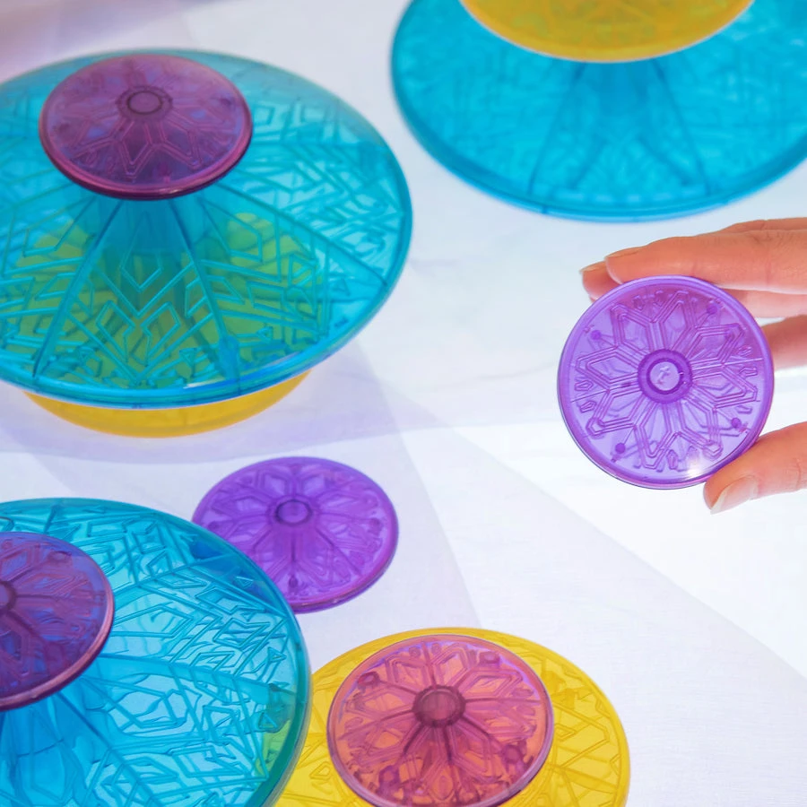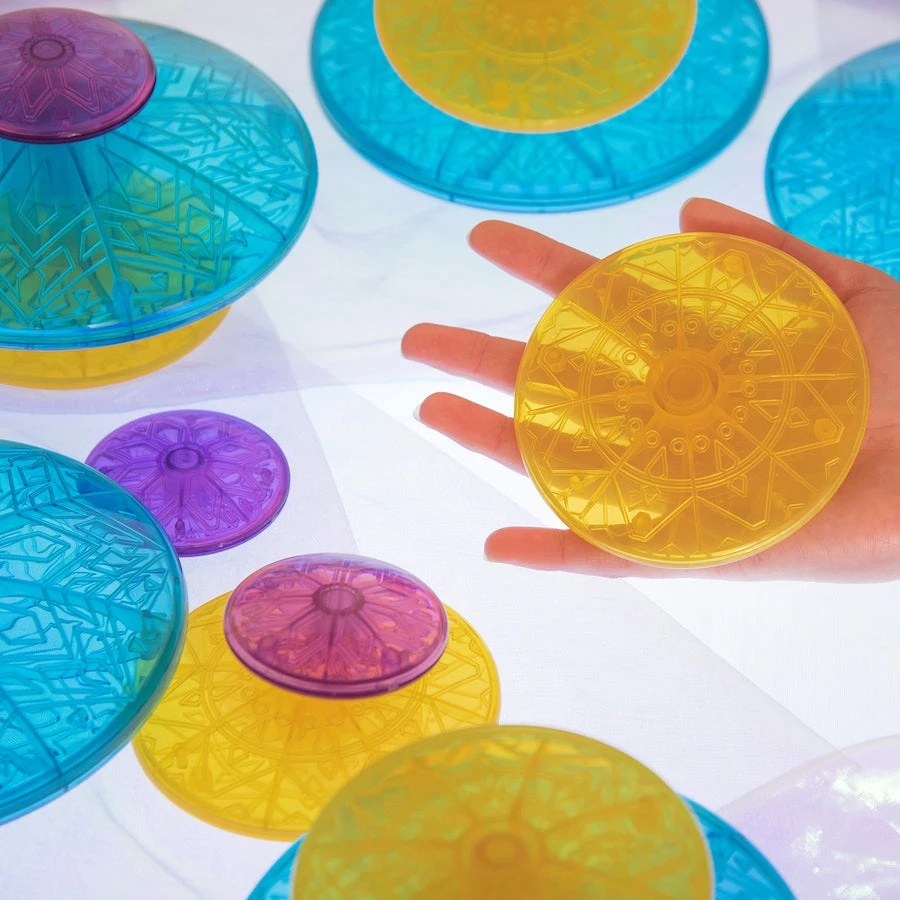 Versatile, multi-coloured assortment of jewel like pebbles in various sizes textures and materials to stack, roll, sort, sequence and balance. On a light panel or with a flashlight, stream light for dazzling patterns.