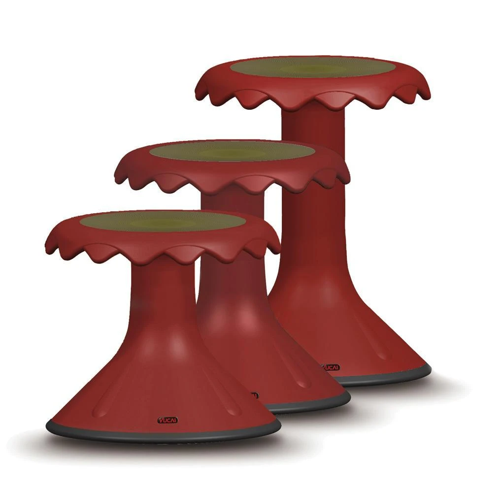 Fun-shaped stools feature a slightly rounded black rubber bottom, allowing users to gently rock.