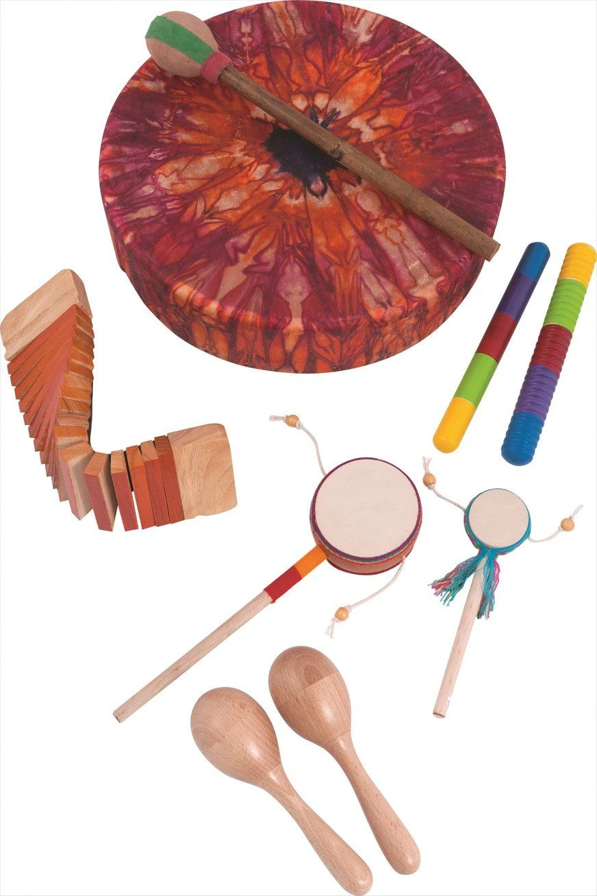 Explore fun and creative rhythms with this Rhythm Circle Kit! Each kit contains 6 instruments that will allow children to experience new sounds and create their own rhythmic beats. The colourful and unique items in this kit will provide the opportunity for entertainment and learning at the same time! Includes a tie dye buffalo drum with mallet, a pair of colourful rhythm sticks, a pair of wooden maracas, a tiny den den, a gourd den den, and a wooden kokiriko.