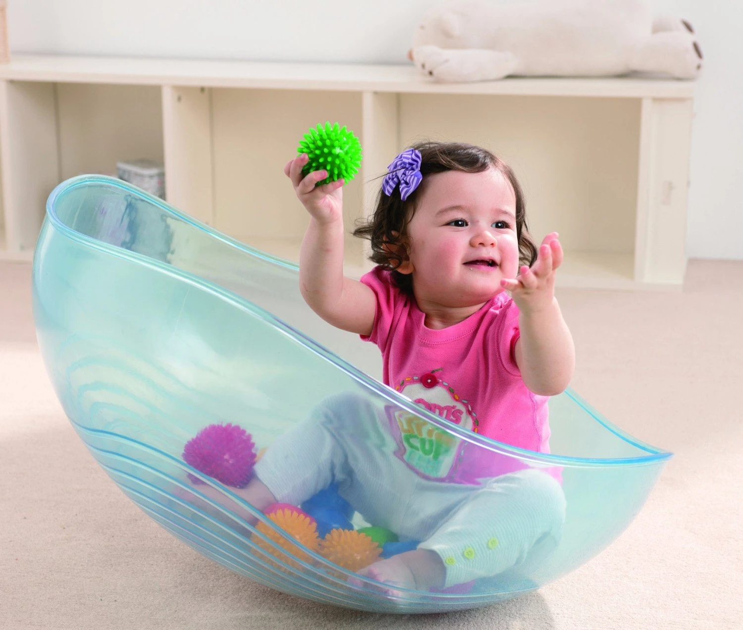 Rocking Bowl helps in the development of balancing skills. Children can rock inside the bowl, which holds up to 2 children, or flip it over and try to balance while lying on top of it! Bowl features ripple lines for anti-slip function. Ages 6 months+.