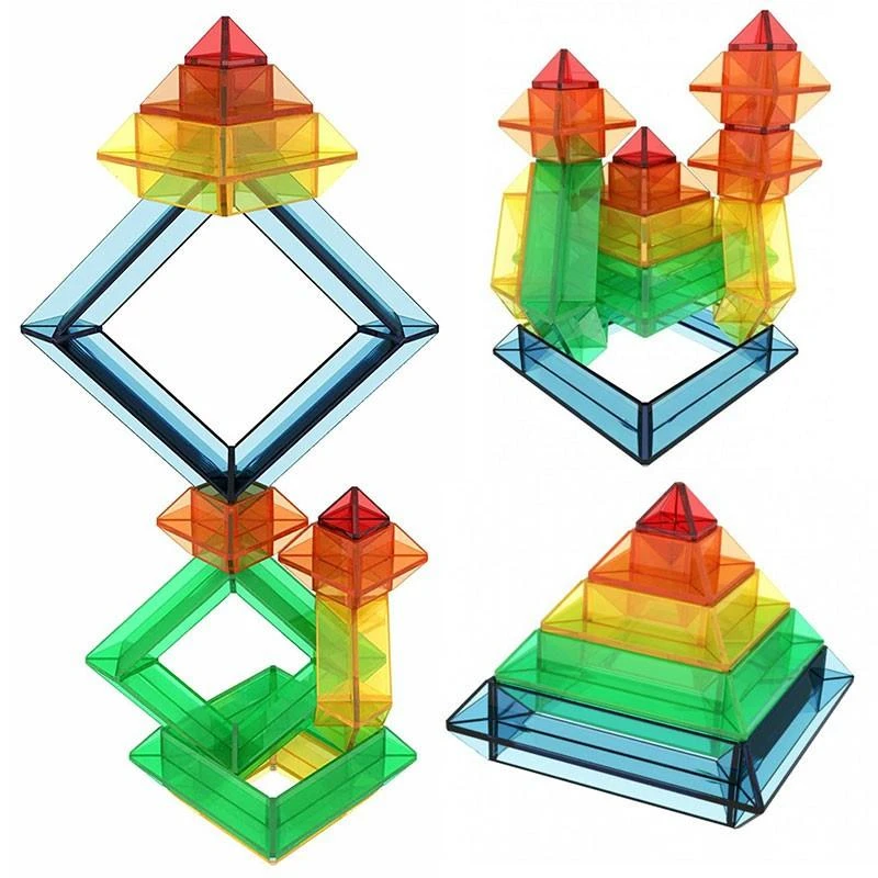 Translucent coloured pieces blend together when you stack, nest, and interlock them. Discover endless variety of colourful shapes and pattern you can make. Ages 3+.
