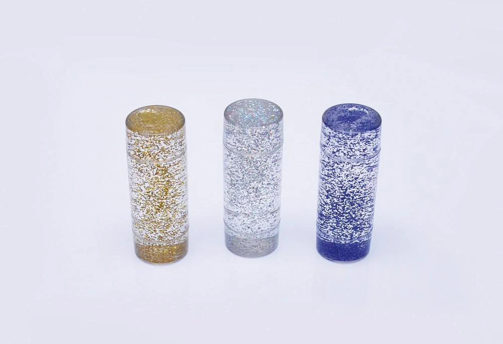 Large cylinders containing gold, silver and blue glitter in clear liquid.
