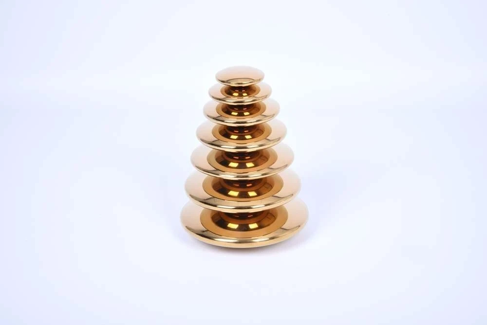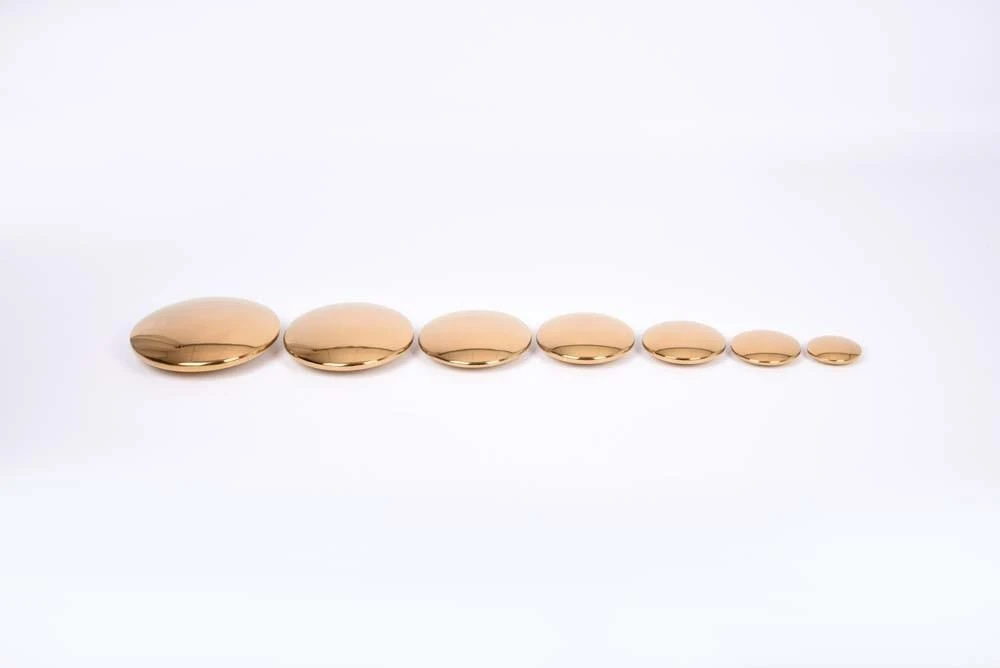 Robustly constructed from stainless steel, these 7 giant gold buttons have a pleasingly rounded discus shape with smooth seamless edges and are graduated in size from 50mm to 140mm diameter.