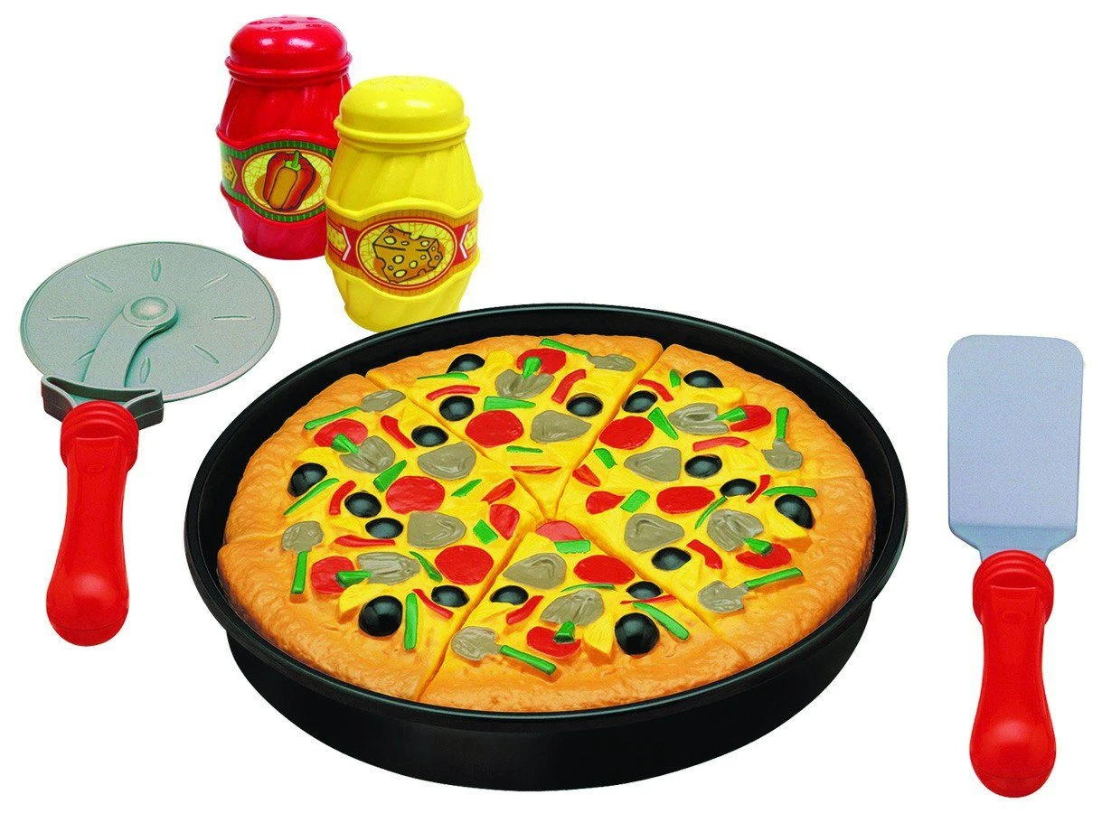 Everything you need to throw a pizza party complete with deep-dish pan, cutter, spatula, cheese and pepper shakers and 6 pizza slices. Pizza slices make realistic cutting sounds when sliced, then fit back together again with Velcro.