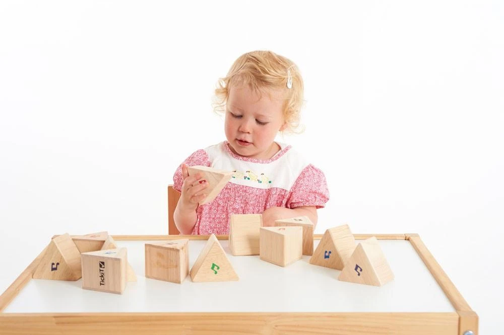The musical note logo only appears on one end of the block so they can be turned upside-down to test the user’s discriminatory skills. Ages 18 months+.