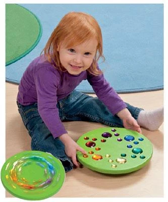 Children can make first experiences with colour mixture and physical laws, for example, rotation, as well as fine-motor skills and visual perception. Large coloured spinning top with inserted sparkling jewel stones, ideal for small children due to easy handling. Ages 1+.