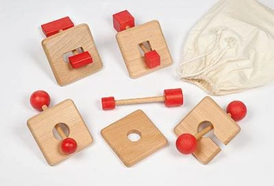 Includes 5 assorted solid beechwood locks and keys measuring 10cm x 10cm (4” x 4”), 1 cloth bag and game instructions.