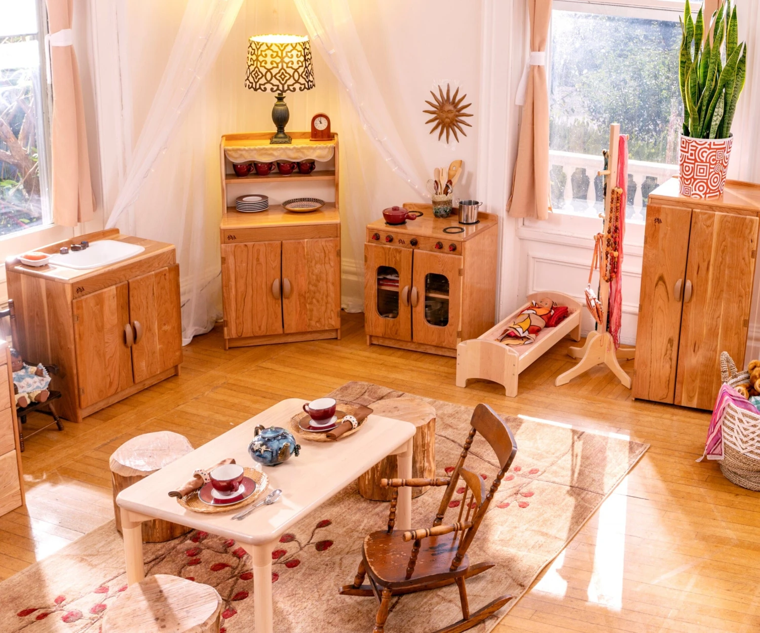 Community Playthings (CP) furniture and toys are purpose built for early years classrooms with predominantly natural materials like solid Cherry. They are designed to realize an open-ended play-to-learn educational goals.